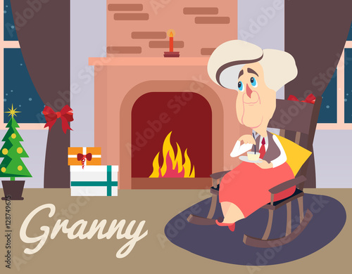 Vector illustration of senior woman with cat sitting on sofa at fireplace in living room. Flat style design.