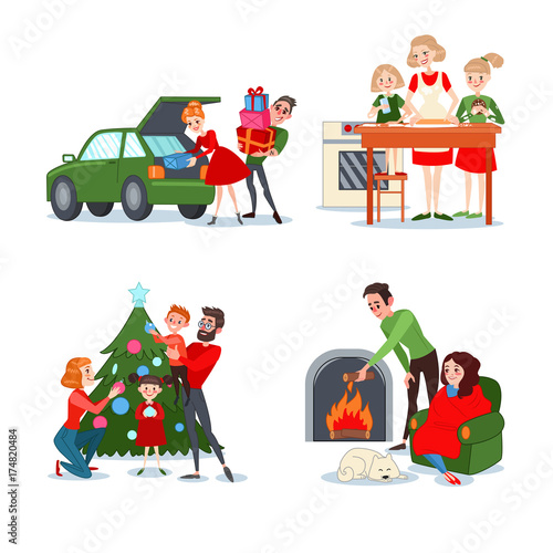 Set of happy family character parent and children camper during outdoor recreation activity on summer holidays. Preparation for picnic, making bonfire, fishing for dinner, taking memory photo