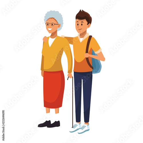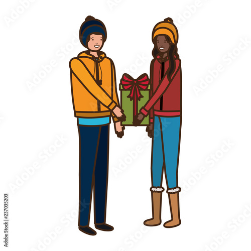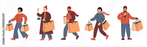 Set of people preparing for celebrating winter holidays. Walking man and woman holding xmas tree, present boxes and purchases. Merry Christmas and Happy New Year shopping vector illustration
