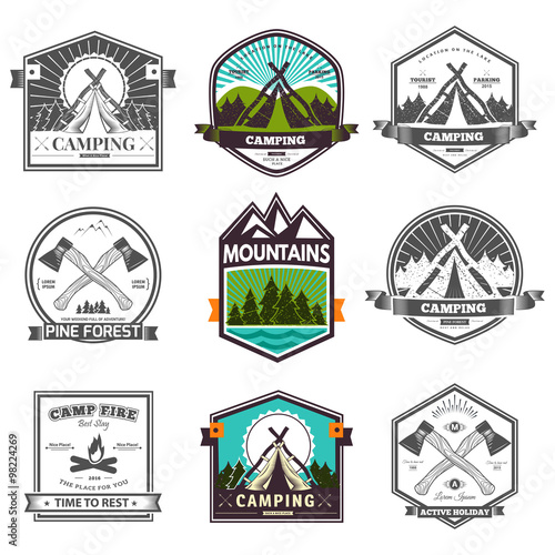 Set of hookah badges and stamps. Round and rectangular form, ribbons, sample text. Flat graphic style vector image.