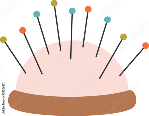 Sewing needles and pins in soft cushion vector icon isolated on white background