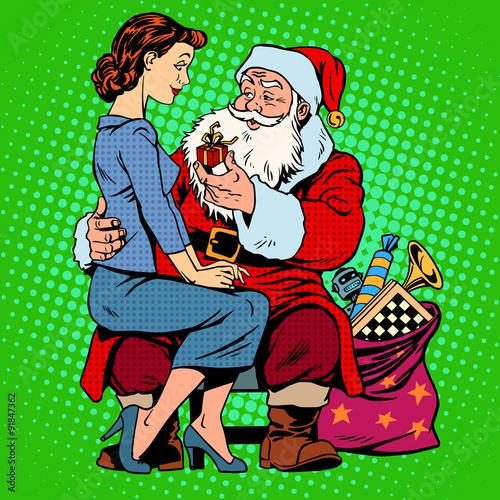 Sexy Santa pin up girl in red dress holding a gift. Vector illustration in comic pop art style. Christmas holidays concept poster.