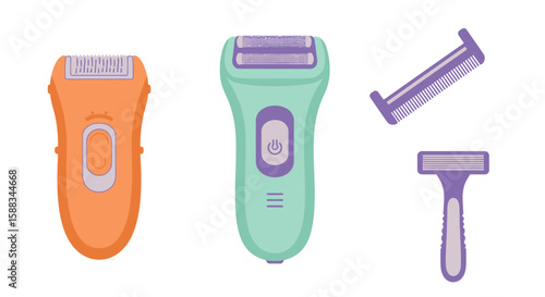 Shaving razor mockup set. Vector realistic illustration of color electric shaver and manual shaving razors for women for silky smooth skin.