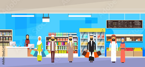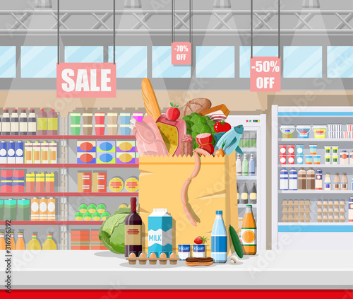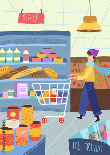 Shoppers in supermarket, grocery store, food shop, market, flat vector illustration. People buying fruits, vegetables, fresh bread, diary products, paying for purchases. Buyers shopping for food.