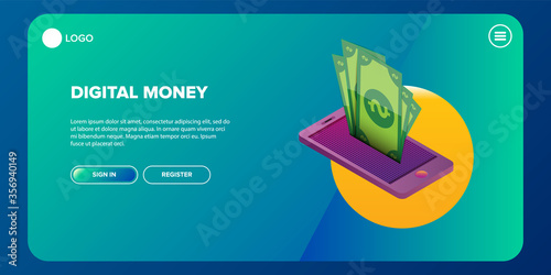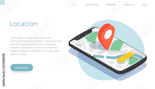 Applications for shopping banner, web template. Vector isometric smartphone with sale, discount, free gift signboards, magnifying glass on screen, copy space, read more button.