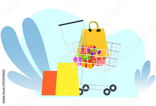 Shopping cart with gift boxes and paper bags, 3d vector illustration. Shopping sale promotion.