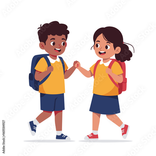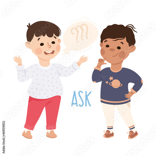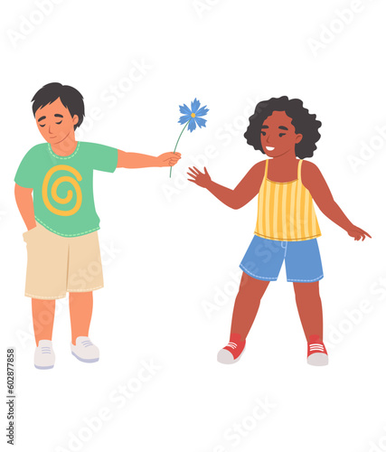 Shy little boy giving flower to girl vector illustration. Cute funny children isolated on white background. Male kid character presenting beautiful blossoms greeting friend with birthday party event