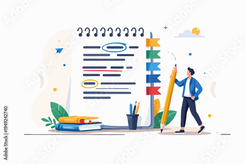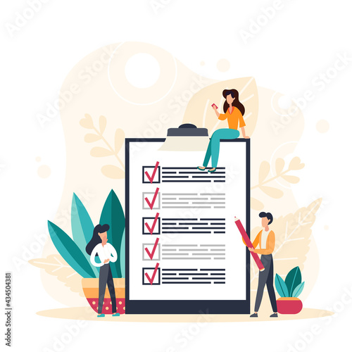 Micro business people signing huge document contract agreement, vector illustration. Successful deal, business and finance concept for web banner, website page etc.