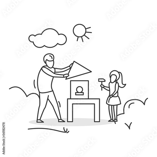Huge microphone and micro male and female characters with headphones, megaphone, music notes, DJ using mixing decks, vector illustration. Night club show live music concept for web banner website page