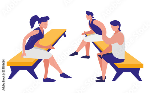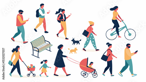 Skate park set, vector flat illustration isolated on white background. Isometric skateboard ramp and other skatepark equipment, happy teens riding skateboards and performing stunts.