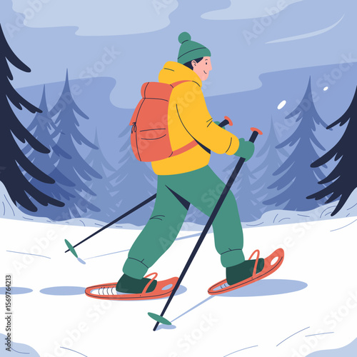 Ski resort poster in vintage retro style. Winter season vacation in mountains concept vector illustration. Female skier on a mountain slope. Travel in alps.