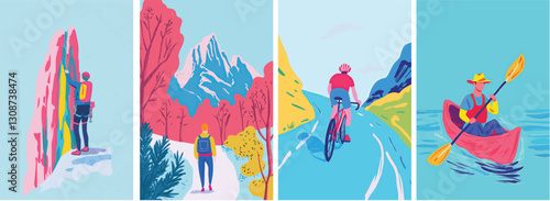 Ski resort with skiers, cable cars, ski lifts, vector illustration set. Winter holidays and sport activity. Winter season mountain landscape with alps chalet. Mountain ski, snowboard, downhill track.
