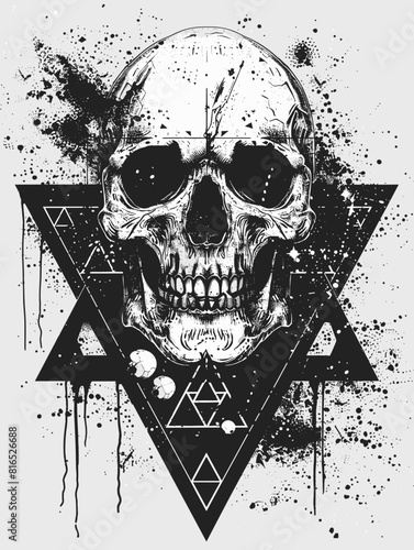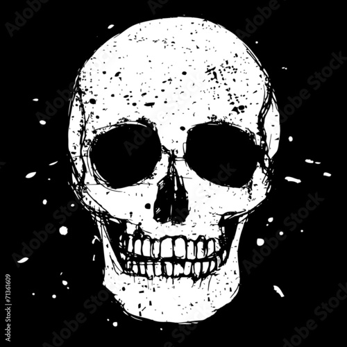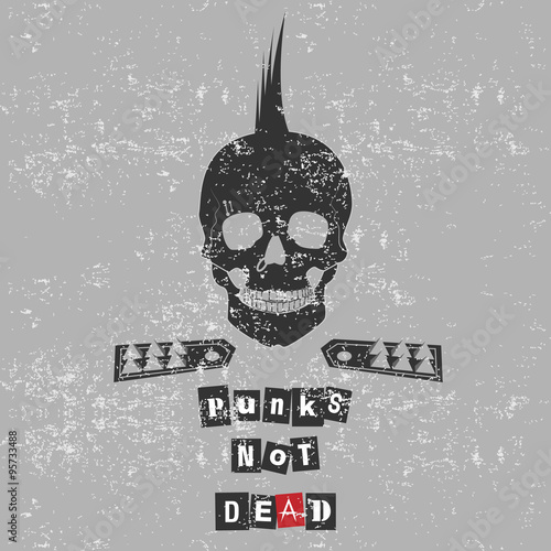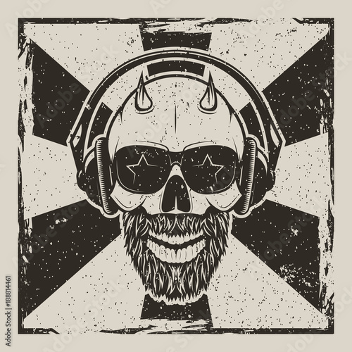 Vector illustration of human skull with mohawk listening to music using headphones. Skull music punk vintage grunge design for t-shirt or print.