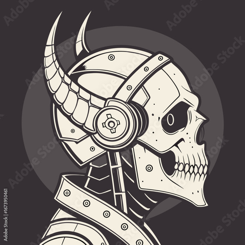 Vector illustration of human skull in hat and with headphones listening to music. Skull music side view vintage grunge design for t-shirt or print.