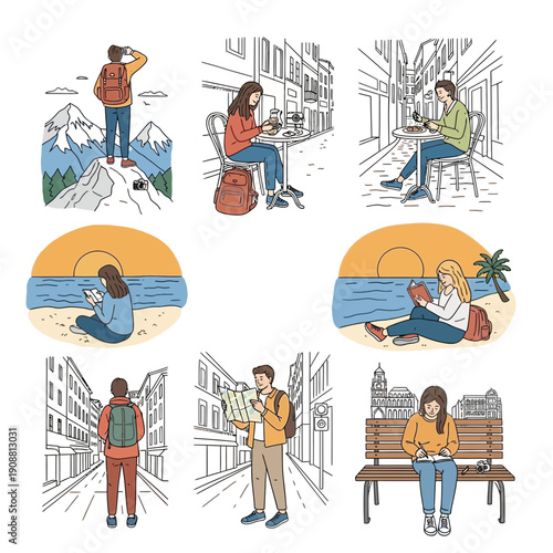 Sleepless young people characters using mobile in bed vector illustration scene set. Digital gadget and internet technology addiction, insomnia problem concept