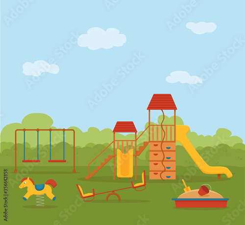 Vector illustration of child girl sliding down the slide in playground. Slide concept design element in flat style.
