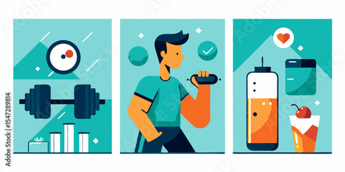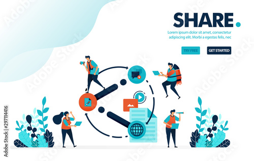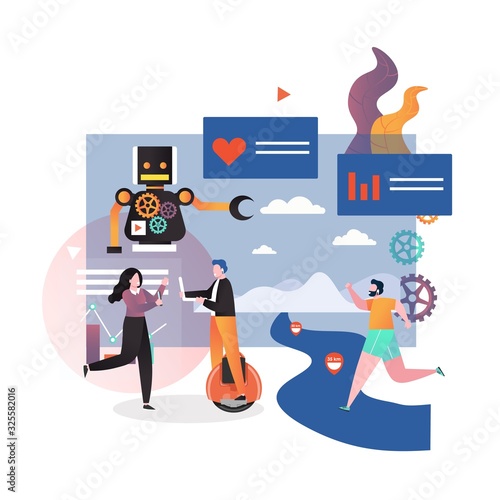 People using smart modern gadgets, vector illustration. Micro male and female characters riding self balancing mono wheel with laptop in hands, using mobile phone with running activity tracking app.