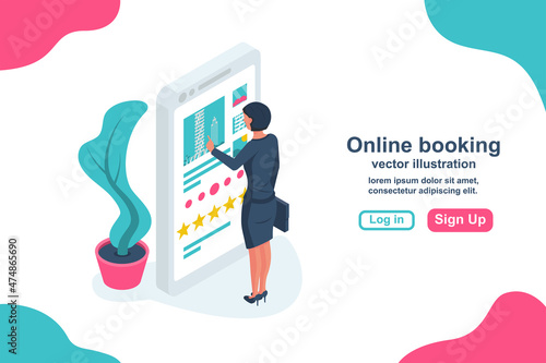 Smart watch technology with sport fitness tracker advertising vector poster, website banner realistic design. Woman running and using fitness tracking app to monitor workout and health indicator