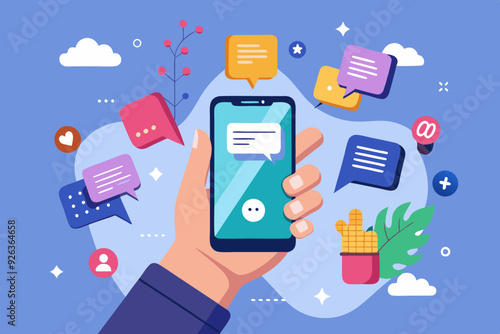 Smartphone surrounded by social media and digital communication symbols. 3d render vector illustration. Mobile phone render, business app, 3d mockup.