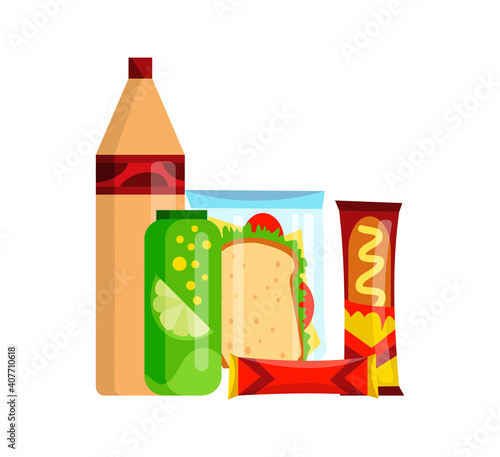 Snacks to the beer vector flat style design illustration. Beer bottle, chips, pistachio, croutons, crackers, salted dried fish, cheese. Beer snacks composition for web banner, website page etc.