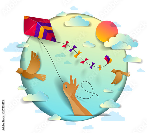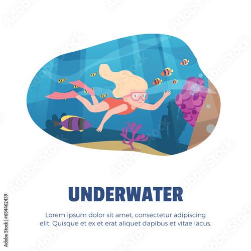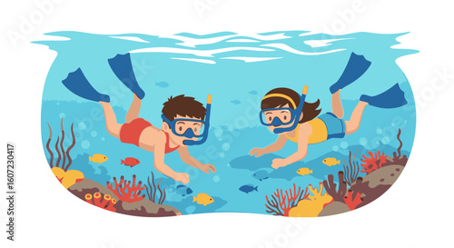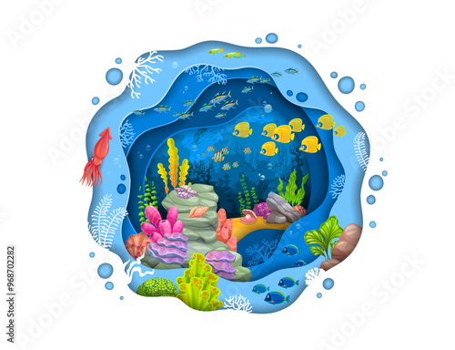 Vector layered paper cut style underwater world and happy tourist couple swimming using snorkel and mask. Snorkeling, summer beach activity composition for web banner, website page etc.
