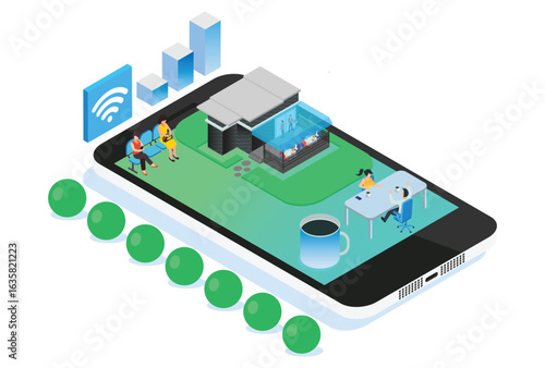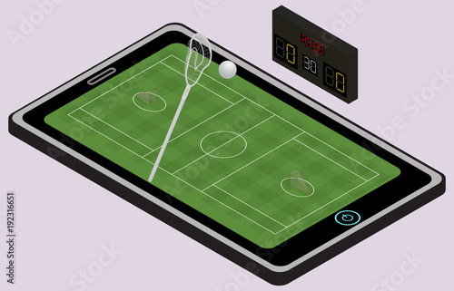 Soccer online concept vector illustration. Isometric soccer field, soccer ball and indicator board placed on smartphone screen.