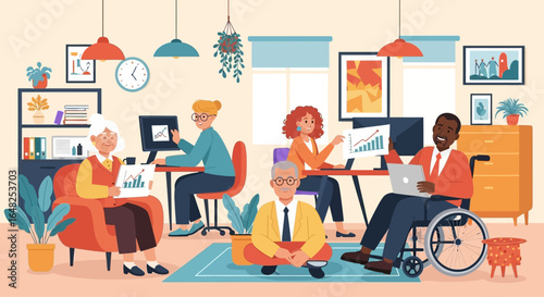 Social distancing in hospital reception room concept illustration. Vector web site design template. Doctor in clinic protected by glass from coronavirus spreading. Patients use face mask in hospital.
