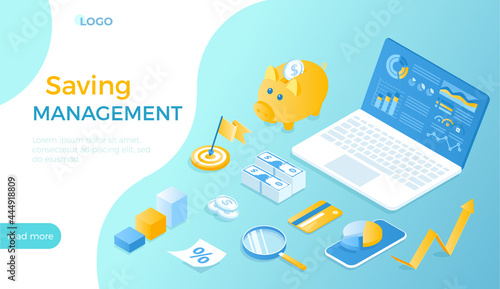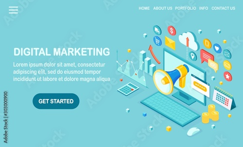 Social media marketing landing page website template. Vector isometric illustration. Smm strategy concept for digital marketing, social campaign.