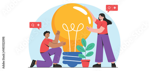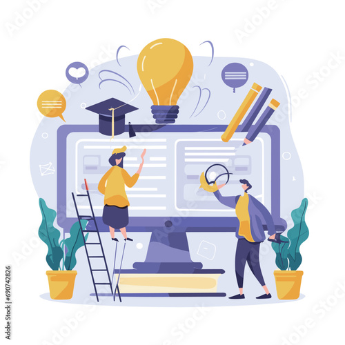 Male and female characters analysing charts on huge laptop screen, holding magnifier, envelope and heart, vector illustration. SMM, Social media marketing concept for web banner, website page etc.