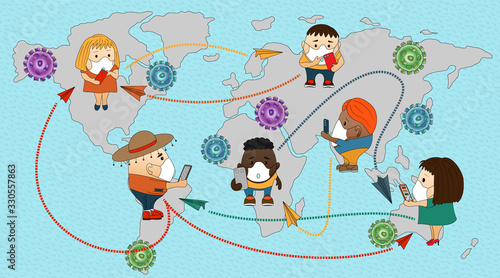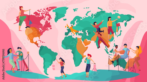 Social media network people community flat cartoon vector illustration. Online connection and communication. Man and woman from different country connected together