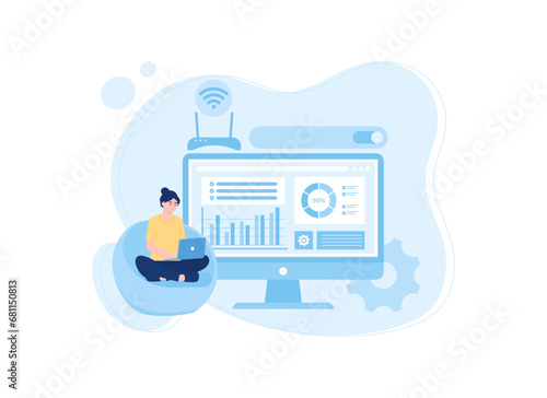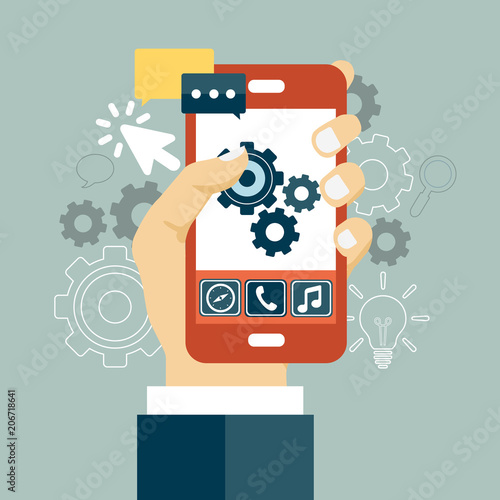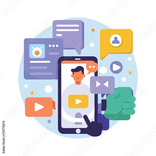 Social photo sharing app concept vector flat illustration. Mobile phone with instagram service app, social network like icon, human hand with thumb up approval gesture and positive estimation sign.