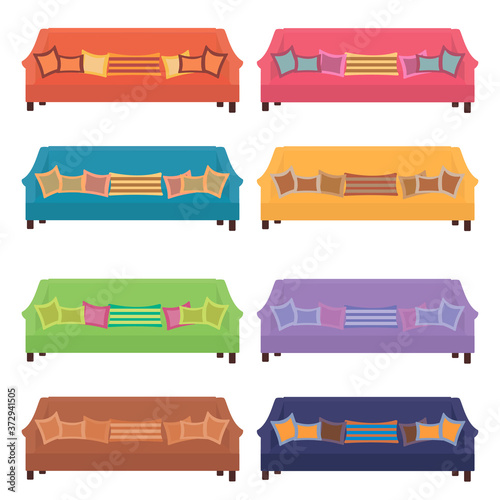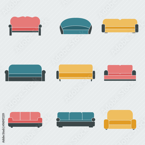 Sofa icon set, vector flat illustration isolated on white background. Different types of comfortable couches for every living room.