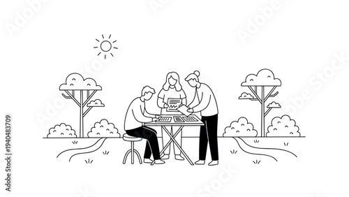Solar panels, female characters using smartphone, laptop charging from solar power or sun energy converted into electrical energy, vector flat style design illustration. Clean renewable energy source.