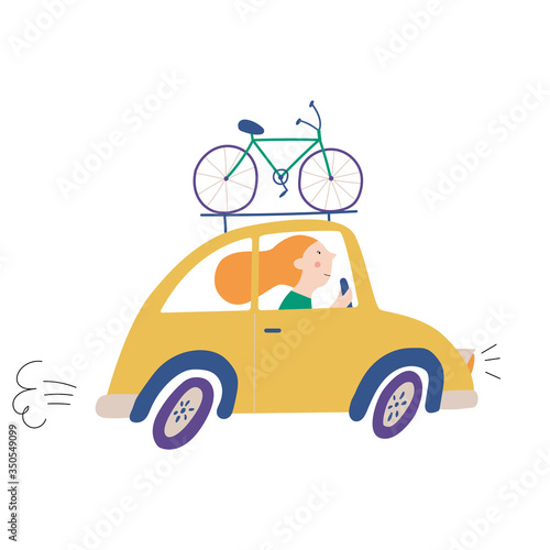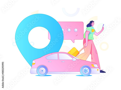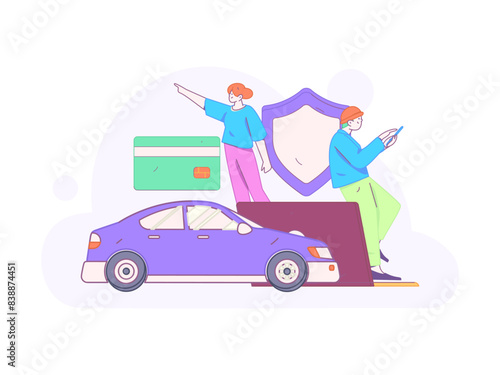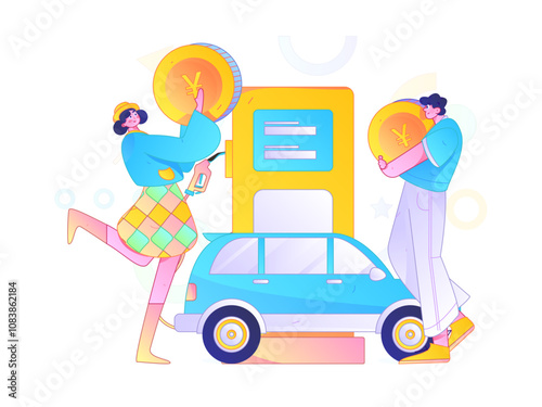 Electric car charging at charger station for electric vehicles in front of solar panels, male and female characters, vector illustration. Eco transport, solar charging station concept.