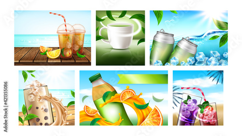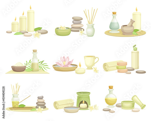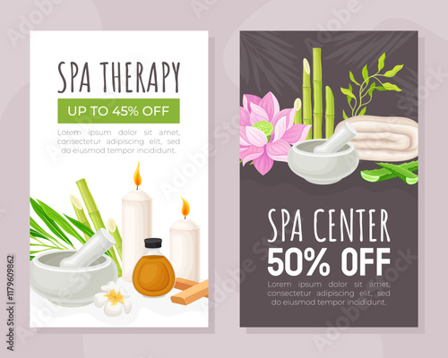 Spa center horizontal banner vector template set. Realistic illustration of bamboo stalks with leaves, aroma candles, soil, massage oil, stones and flowers. Spa beauty salon cards, web banners.