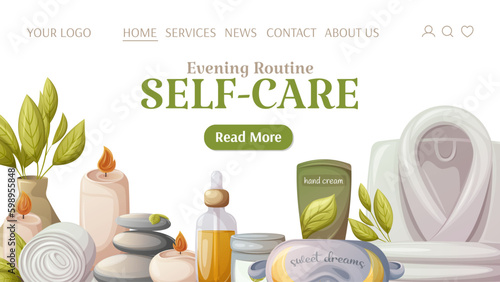 Spa vector poster design template. Spa center composition with realistic natural coconut oil and cosmetics, stones, bathrobe, towels and copy space.