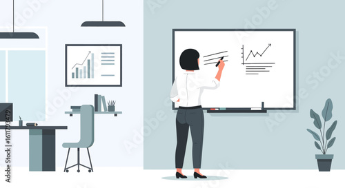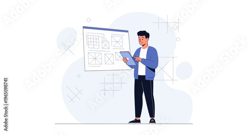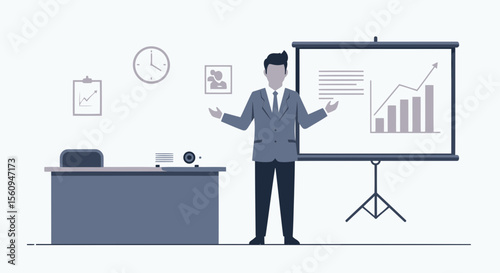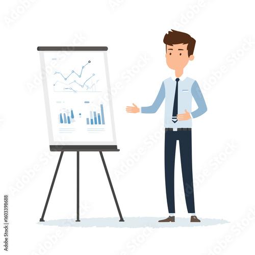 Vector illustration of scientist, design engineer giving presentation or lecture. Space exploration, development of aerospace technology, space science education concept. Flat style design.