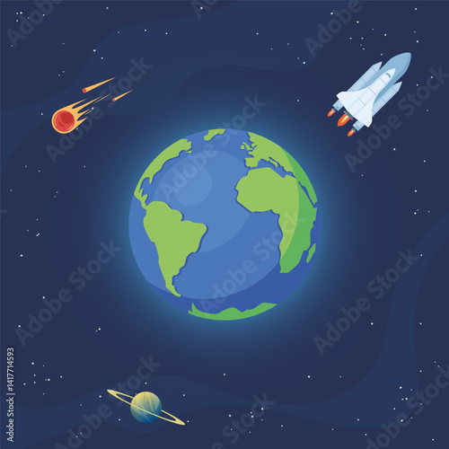 Space rock diagram. Vector realistic illustration. Planet Earth and celestial objects comet, asteroid, meteor, meteorite, meteoroid and meteor shower. Astronomy science poster, presentation.