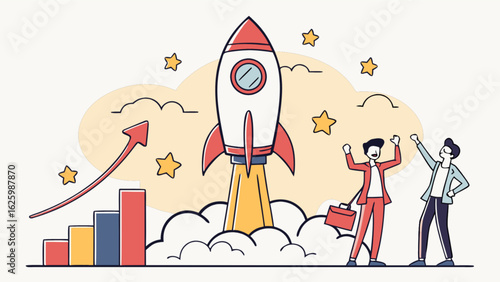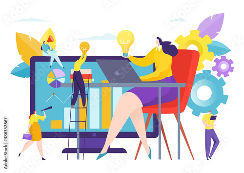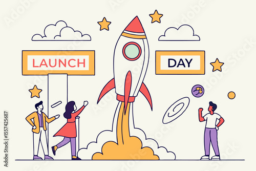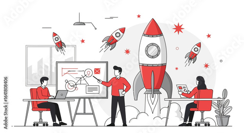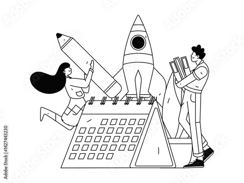 Vector illustration of tiny people engineers constructing big rocket, astronaut. Space exploration technology, aerospace industry concept for web banner, website page etc.