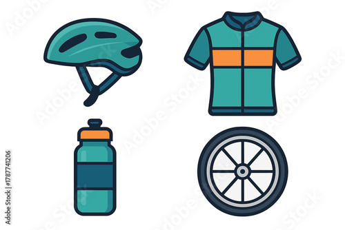 Sport bike vector flat style design illustration. Bicycle frame, wheel, cycling apparel, protective sunglasses and gloves. Cycling clothes and bicycle parts composition for web banner, website page.