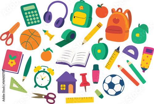 Sport equipment big set of happy sportsman and sportswoman, fitness and gaming items vector illustration isolated on white background. Healthy lifestyle tools and people wellness concept