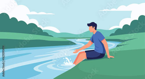 Vector illustration of young man in headphones training in the park. Sportsman flat style design element.