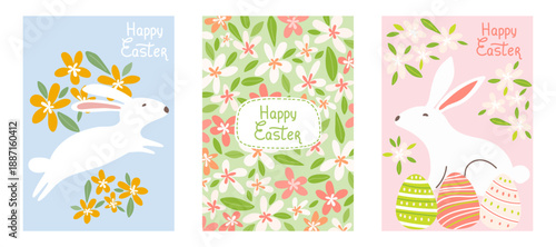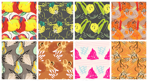 Spring flower seamless pattern. Vector set of floral background patterns. Cherry sakura blossom, village farm houses with trees, tulip flowers.