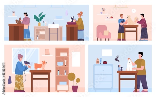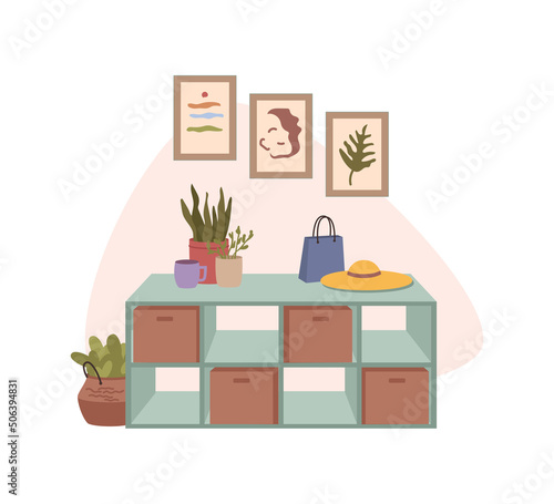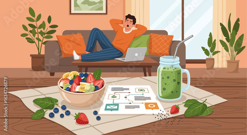Stay at home concept vector illustration. Man listen music on vinyl recorder. Woman doing yoga and meditation at home. Girl read and relax on sofa. Mindfulness, wellbeing and relax.
