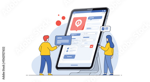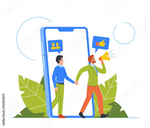 Vector flat style design illustration of big smartphone, computer monitor, tiny people sending and receiving messages. Stay connected using mobile phone computer tablet, stay in touch, messaging app