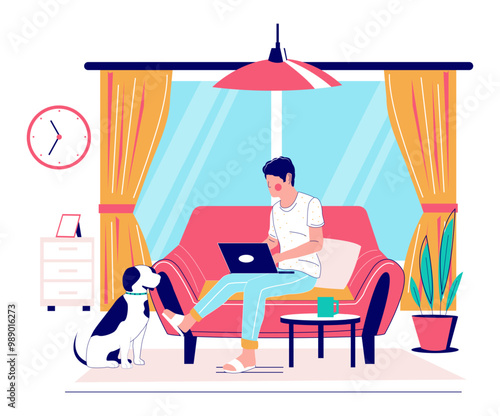 Stay home vector website template, landing page design for website and mobile site development. Man working on laptop sitting on sofa Self isolation remote work from home during coronavirus quarantine