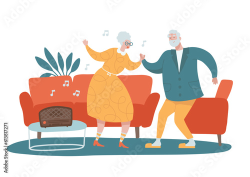 Corona virus pandemic. Elderly couple sitting on sofa at fireplace in living room vector flat illustration. Stay home to save lives, self isolation quarantine social distancing to prevent virus spread