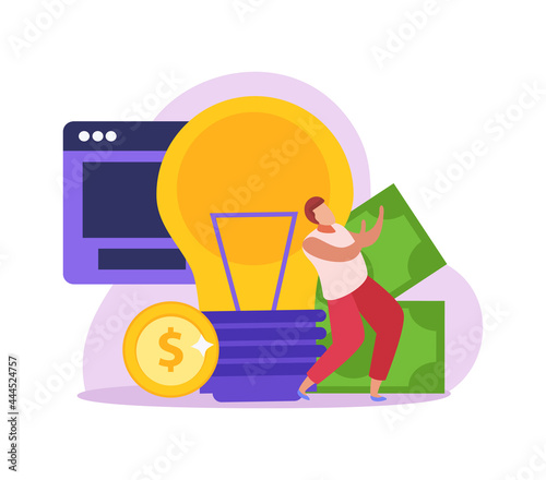 Stock market and trading concept flat vector illustration. Computer screen, board with stock market data and successful business people happy traders, gold coins.