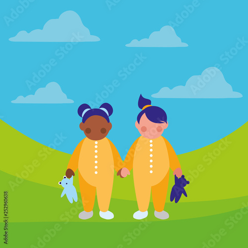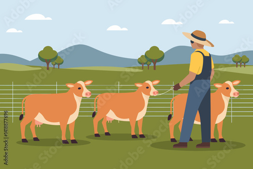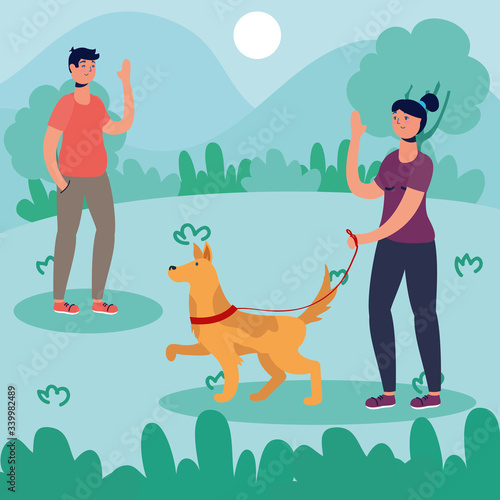 Stone age people two hunters with club and spear stalking roe buck deer. Vector flat style design illustration.