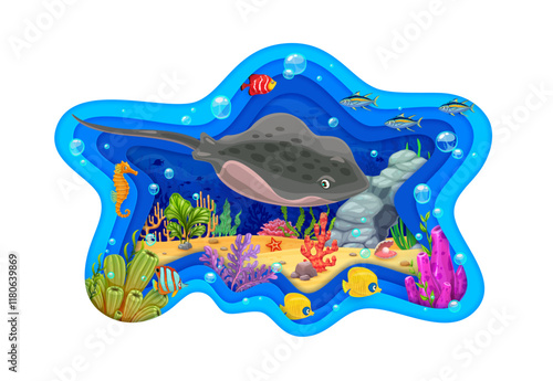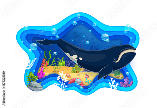 Stop ocean plastic pollution, vector illustration in paper art style. Underwater sea with plastic trash shaped dolphin, marine animals, coral reefs. Ocean environmental problem concept.